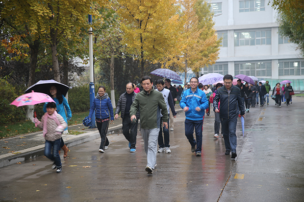 上午8点40分,参加此次徒步大会的教职工在北校区办公楼前广场集合。9点整随着发令枪响起,开始了5公里的徒步健身活动。尽管天空中飘着淅淅沥沥的小雨,但是职工们的参与热情丝毫不减,大家打着雨伞在风雨中行进,或快或慢全部完成了赛程。