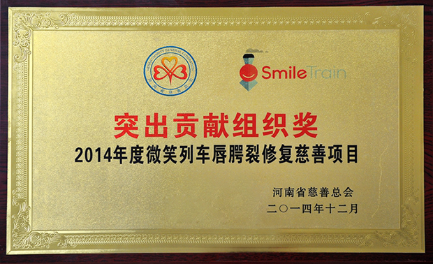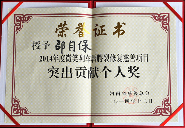本网讯(图文/宋鹏翀)近日,在河南省2014年度微笑列车项目合作医院工作会议上,我校第一附属医院荣获“2014年度微笑列车唇腭裂修复慈善项目突出贡献组织奖”。自2012年以来,第一附属医院已连续三年获得该项荣誉。同时,会议首次对做出突出贡献的个人进行表彰,第一附属医院口腔颌面外科主任邵月保荣获“2014年度微笑列车唇腭裂修复慈善项目突出贡献个人奖”。