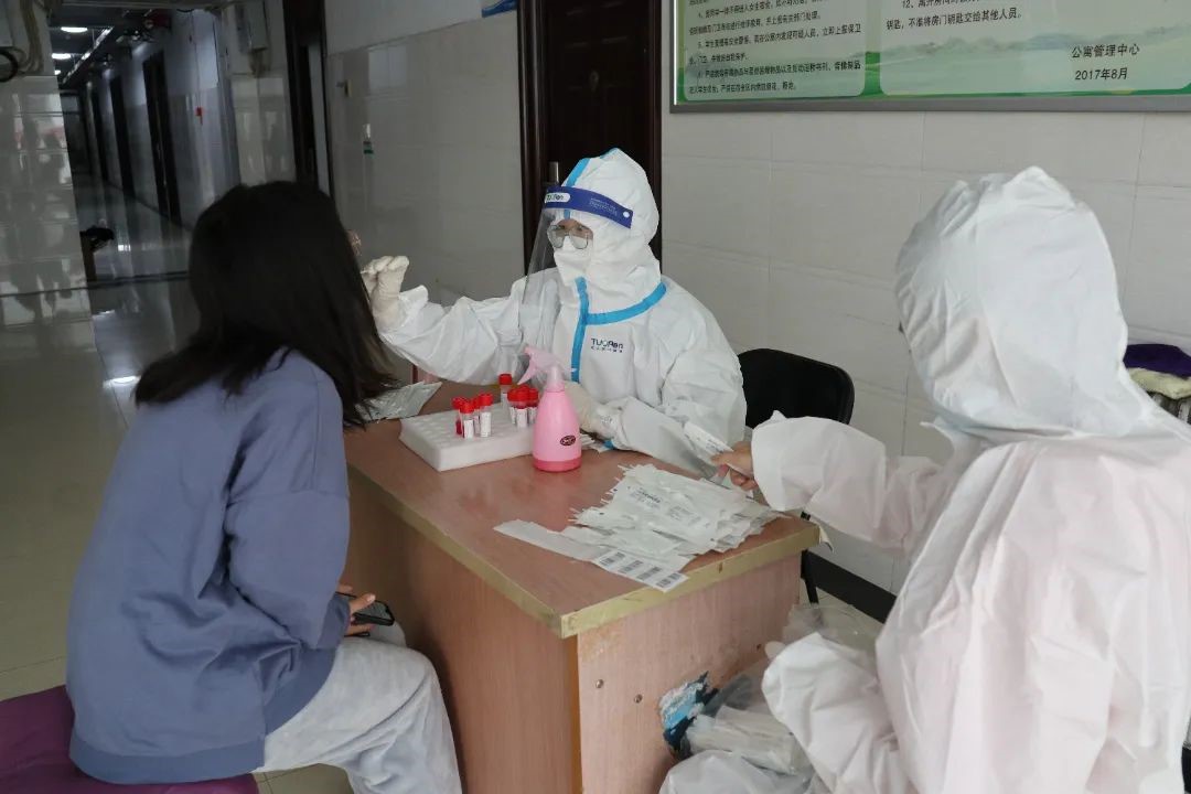 在核酸采样点,无论怎样的天气,新医师生在志愿者的引导下有序排队,经过扫码登记后,来到核酸采样“大白”面前,坐下的同时摘下口罩,仰头张嘴。采样完成后,“大白”熟练地把采样棉签放进采样管里,接着是下一个,再下一个。"大白”们早已习惯,他们一遍遍重复着同样的话语,每天穿着防护服,戴着口罩和面屏,防护服下被汗水浸湿的衣服,被口罩磨红压破的皮肤,长期处理样本管手指磨出的老茧,都是刻在他们身上的勋章。