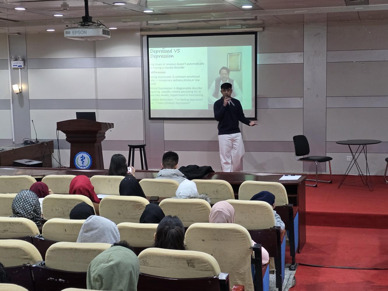 讲座中,他围绕 “抑郁与焦虑的认知” 展开,用通俗的语言解释抑郁与焦虑的定义、常见表现,破除 “心理问题等同于心理疾病” 的错误认知。同时详细列举心理健康状况变差的典型标志,如情绪持续低落、睡眠质量下降、社交意愿减退等,帮助学生及时识别自身及身边同学的心理异常信号。