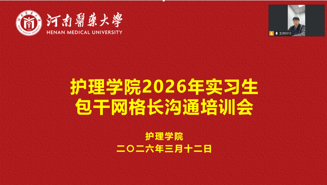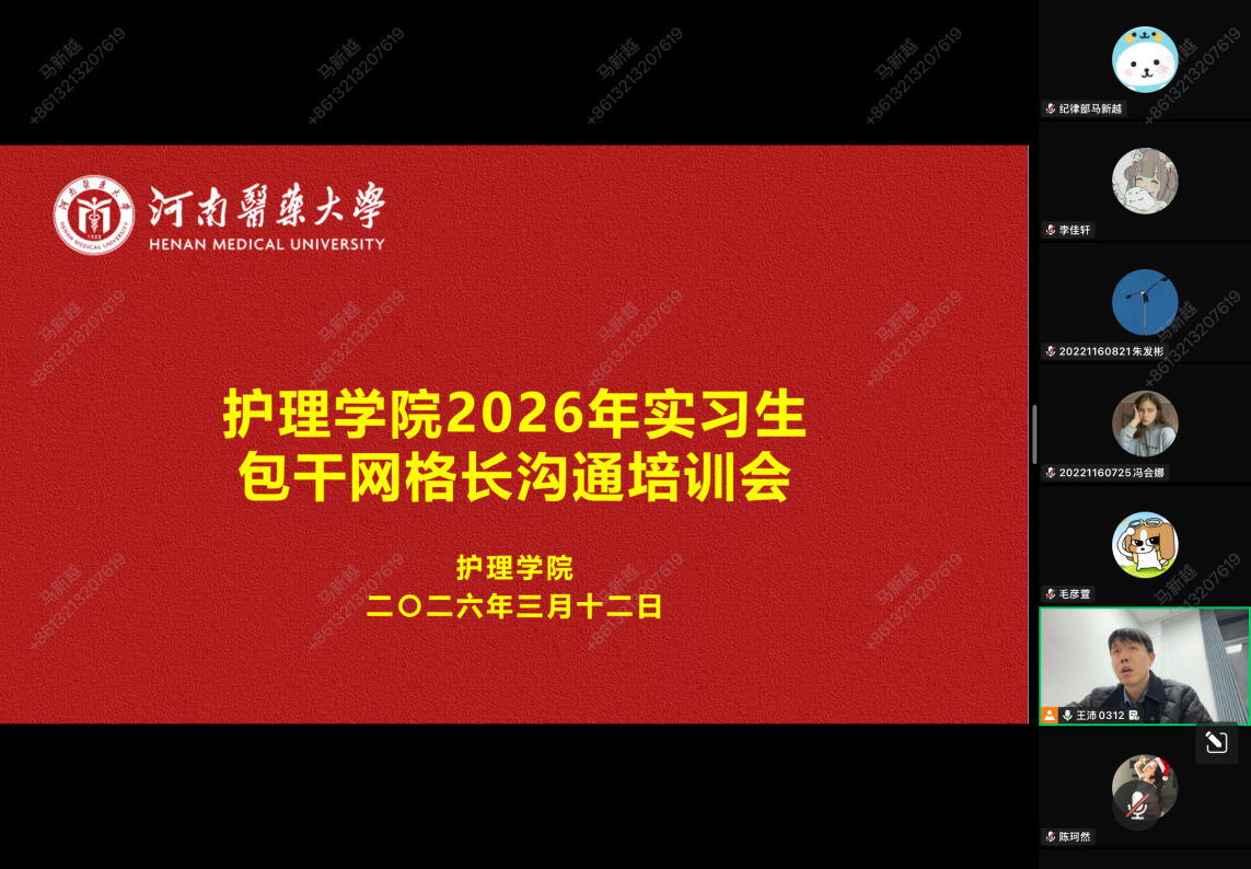 为切实保障实习期间学生安全,压实管理责任,确保2026届毕业生实习工作平稳有序推进,3月12日晚,护理学院组织召开2022级实习生包干网格长培训会。会议由22级辅导员王沛老师主持,22级包干网格长参会,会议就实习收尾阶段各项安全管理要求进行全面部署。