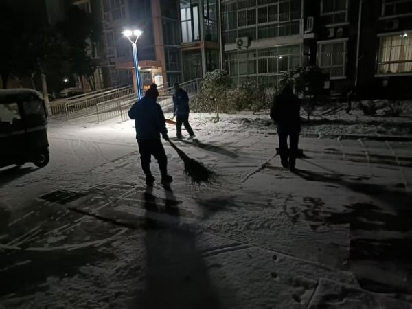 后勤三个党支部党员先锋队联合物业人员迅速开展除雪行动,大家手持扫帚、雪铲,分散在各楼宇出入口、人行步道、台阶等处,全力进行人工清扫和除冰,不畏严寒、连续作业,忙碌的身影成为校园里一道温暖而坚实的风景。