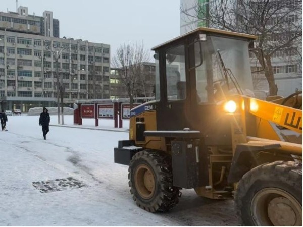 1月20日降雪虽止,但路面结冰湿滑,为确保学校师生出行安全顺畅,凌晨铲雪车率先出动,对校园主干道等大面积区域展开清雪,快速打通主要通行路线。