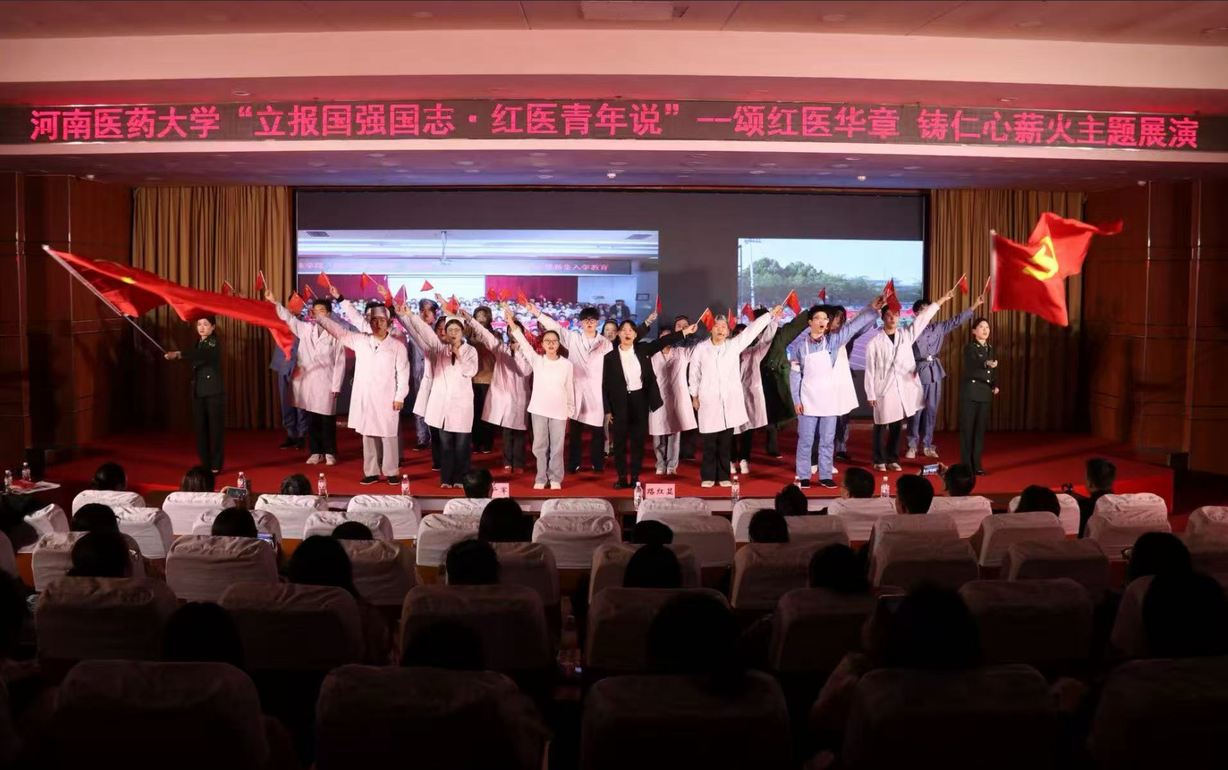 为深入学习贯彻习近平文化思想,落实总书记关于“传承红色基因、培育时代新人”的重要要求,11月6日晚,由党委本科生工作部主办、峻极书院承办的“立报国强国志·红医青年说”青春思政课主题展演在博学楼第一报告厅举行。校党委副书记路红显,校党委委员、副校长姬广军出席活动,党委本科生工作部、本科生学院等职能部门负责人,各书院、学院学生工作负责人、全体辅导员以及各书院、学院学生代表共计400余人参加了本次展演。