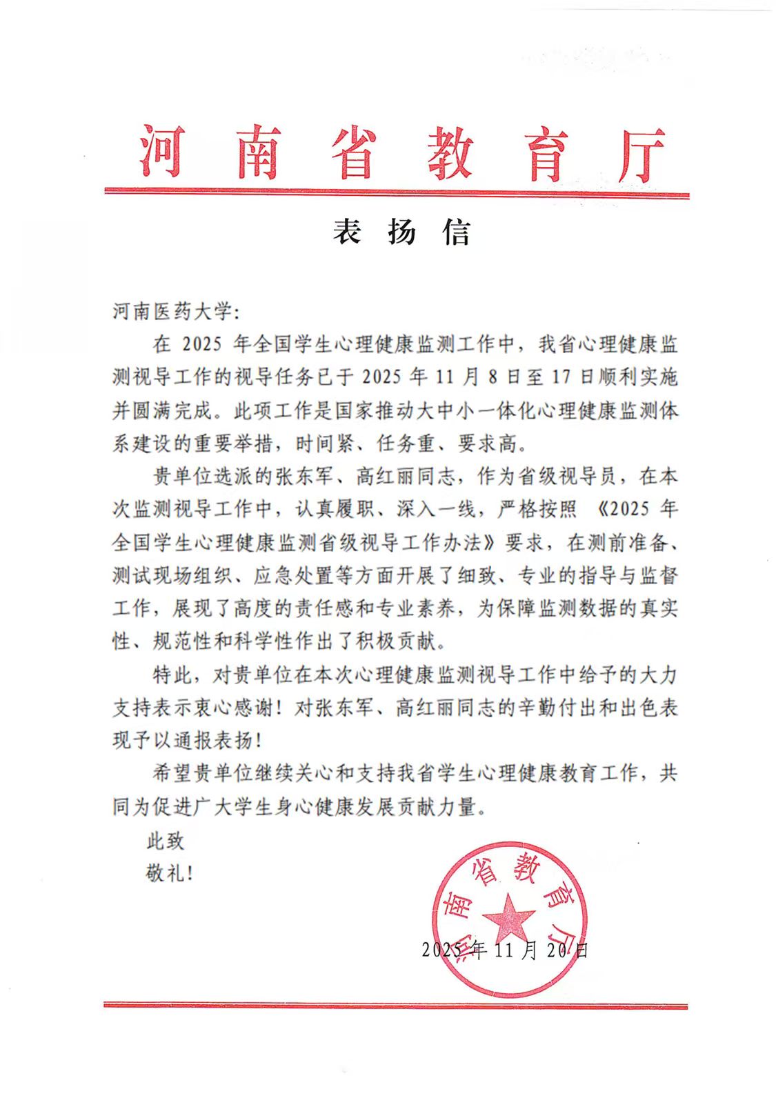 近日,河南省教育厅向我校发来表扬信,对我校在2025 年全国学生心理健康监测省级视导工作中给予的大力支持表示感谢,同时对我校选派的张东军、高红丽两位同志的辛勤付出和出色表现予以通报表扬。