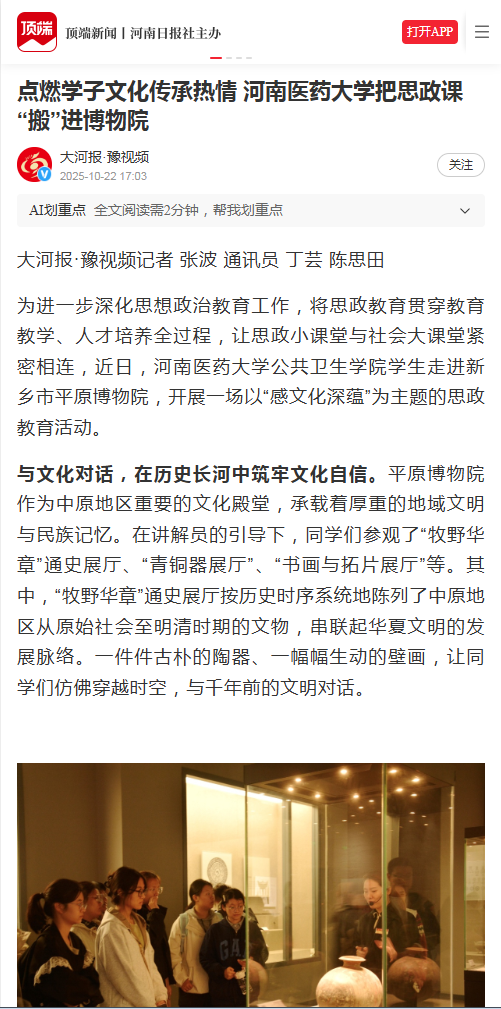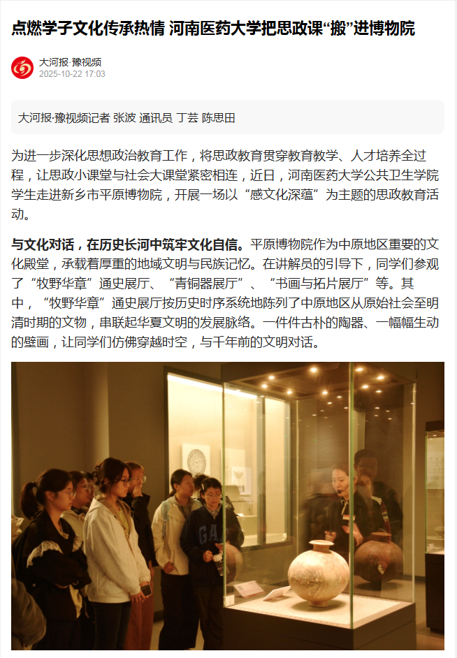 【顶端新闻】等媒体报道我校公共卫生学院学生走进新乡市平原博物院开展思政教育活动