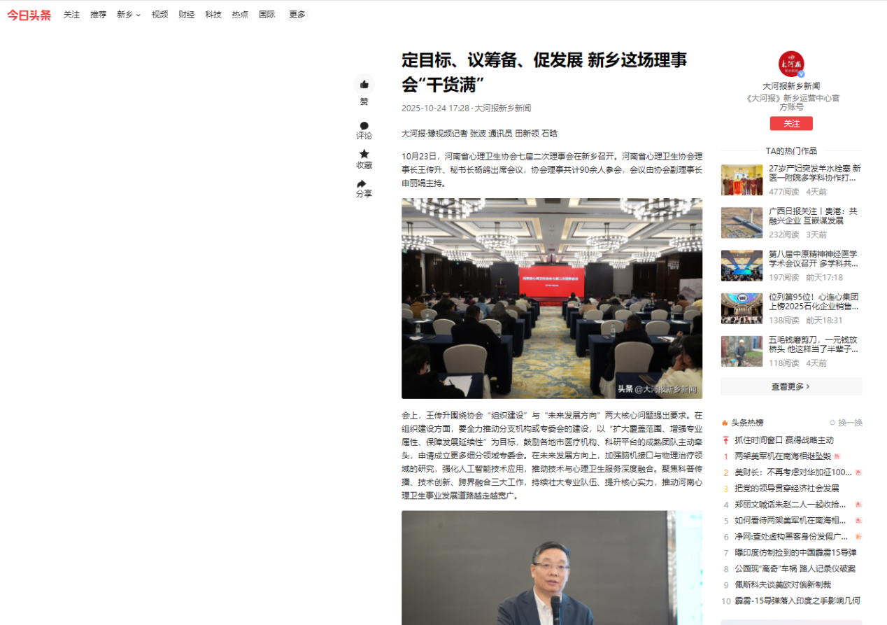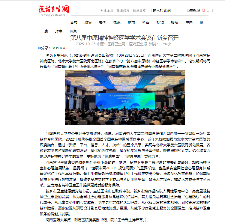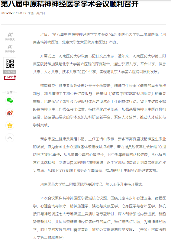 【央广网 顶端新闻 大河报】等媒体报道我校第二附属医院召开第八届中原精神神经医学学术会议