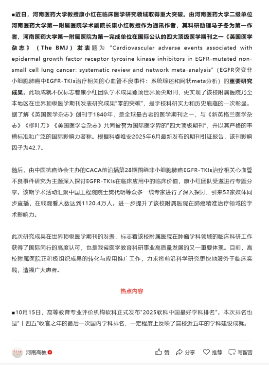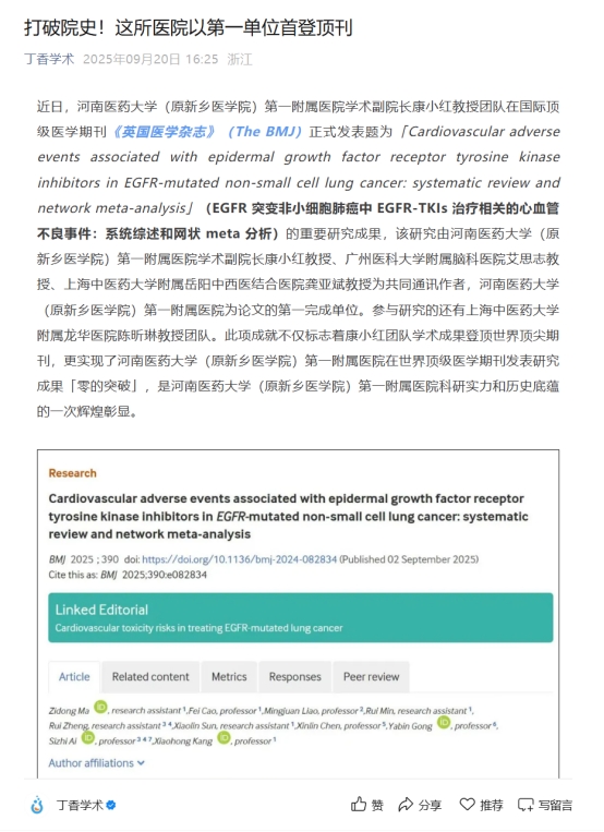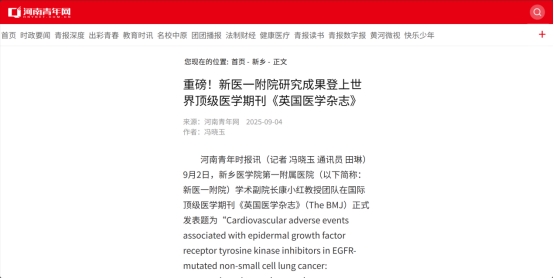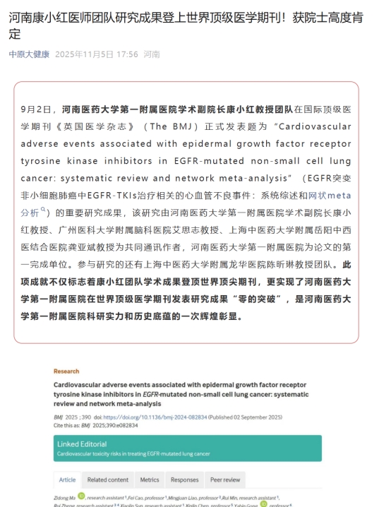 【河南日报、医药卫生网、河南青年网、丁香学术】等媒体报道我校第一附属医院研究成果登上《英国医学杂志》