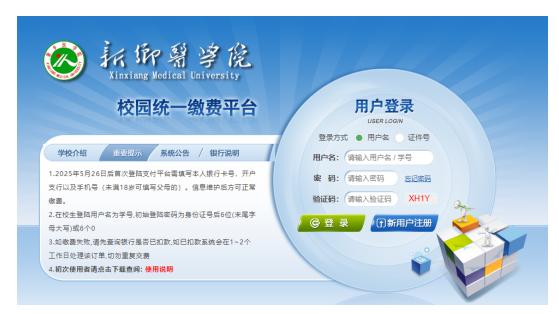 提示:缴费前请各位学生检查学号、金额和收款方(原新乡医学院)防止错缴或受骗。