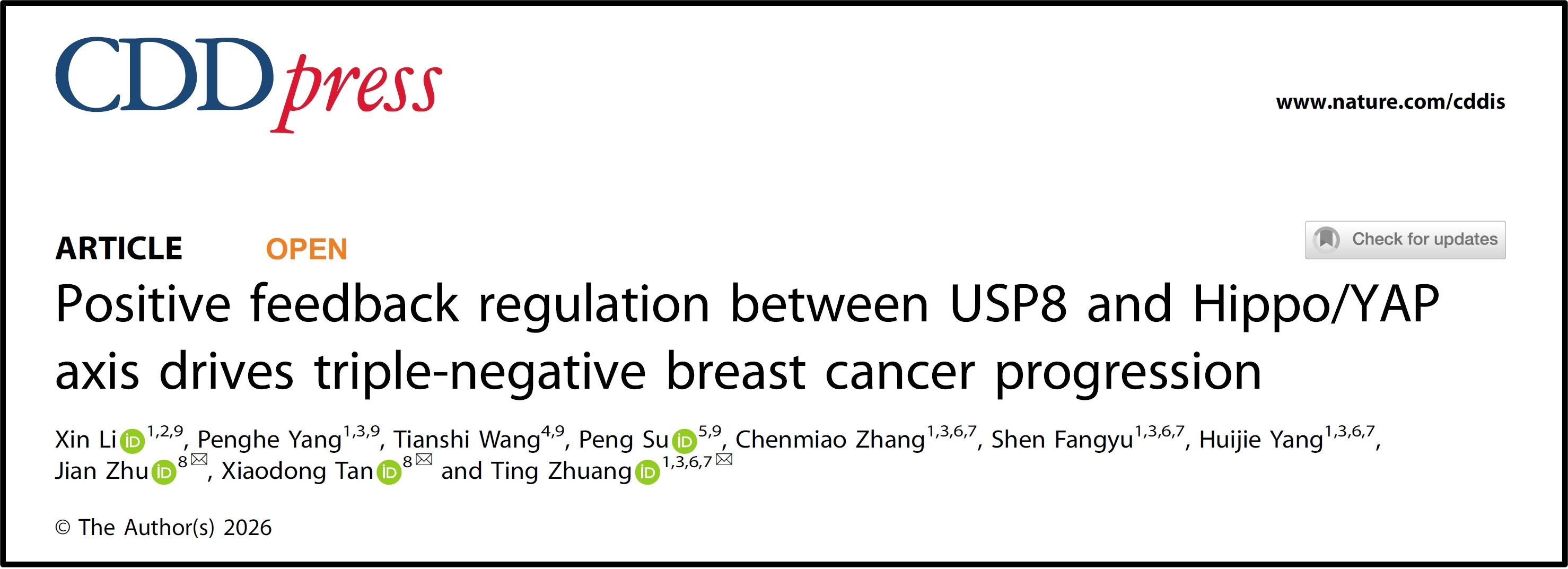 2026年1月21日,国际著名期刊Cell Death & Disease在线发表了题为“Positive feedback regulation between USP8 and Hippo/YAP axis drives triple-negative breast cancer progression”的研究成果。该成果以医学技术学院2020级研究生李欣和2022级研究生杨膨贺为共同第一作者,通讯作者为医学技术学院“新乡市肿瘤侵袭转移精准医学重点实验室”负责人庄婷教授、中国医科大学谭晓冬教授、朱建教授,河南医药大学为第一作者单位和通讯作者单位。该研究受到了国家自然科学基金、河南省优秀青年基金、河南省“高校科技创新人才支持计划”等经费的支持。
