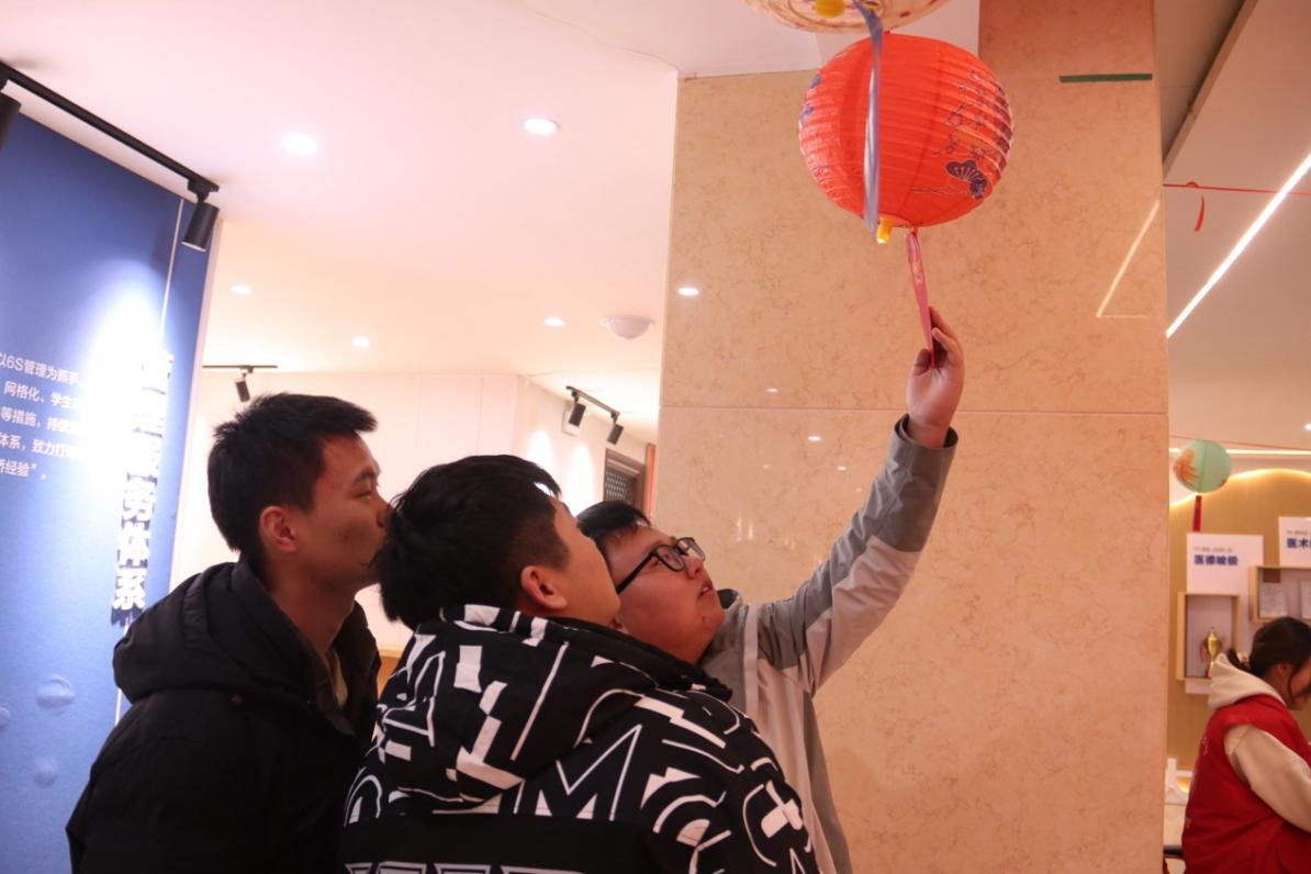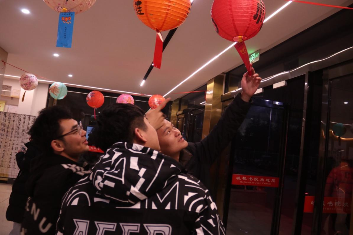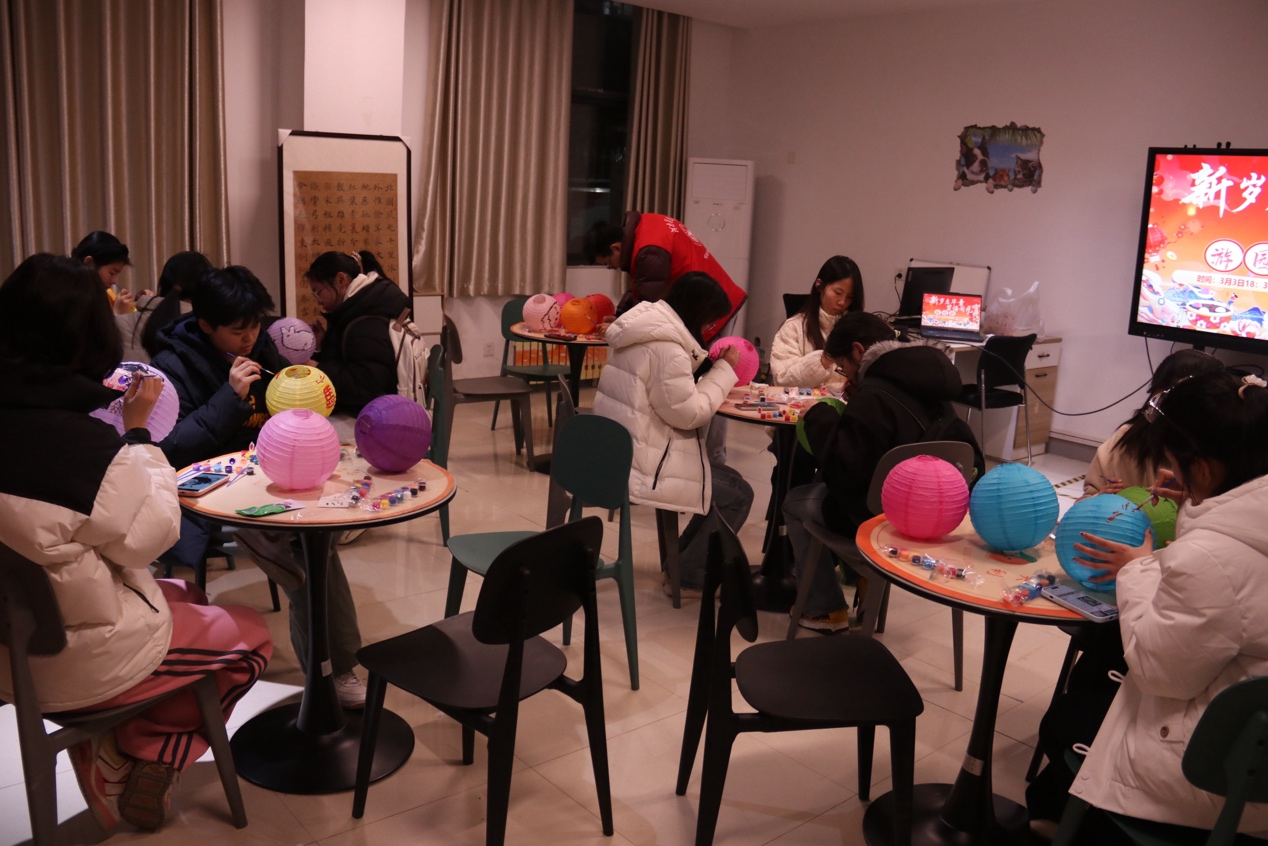 活动当晚,书院四个功能空间同步开放,每个区域都各具特色。从阅览室的手工巧思到青创空间的笔墨生花;从排练厅的古风雅趣到大厅的智力比拼,每个区域都人头攒动、热闹非凡。工作人员提前布置场地、准备物料,全程贴心引导、细致服务,同学们的欢声笑语与节日的喜庆氛围相融,勾勒出一幅“笑语闹元宵” 的生动画卷。