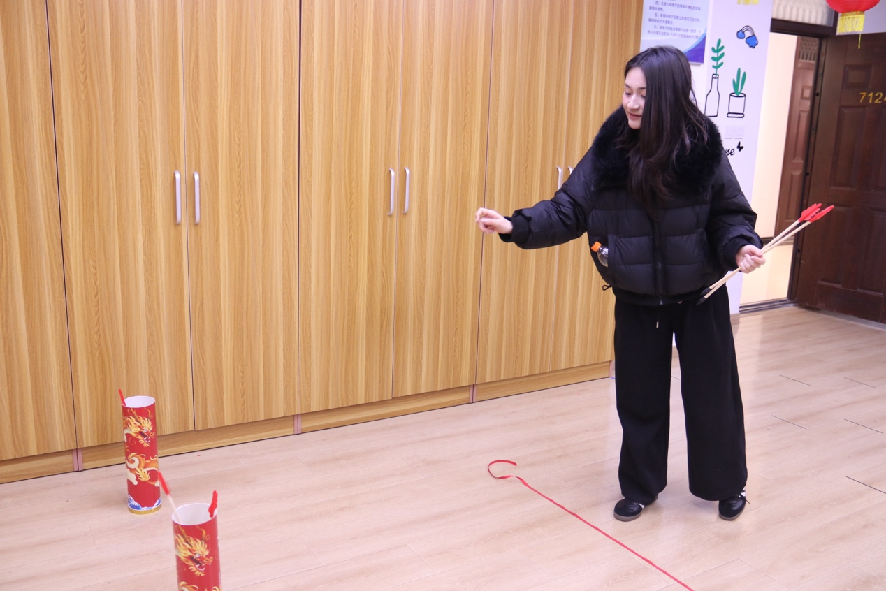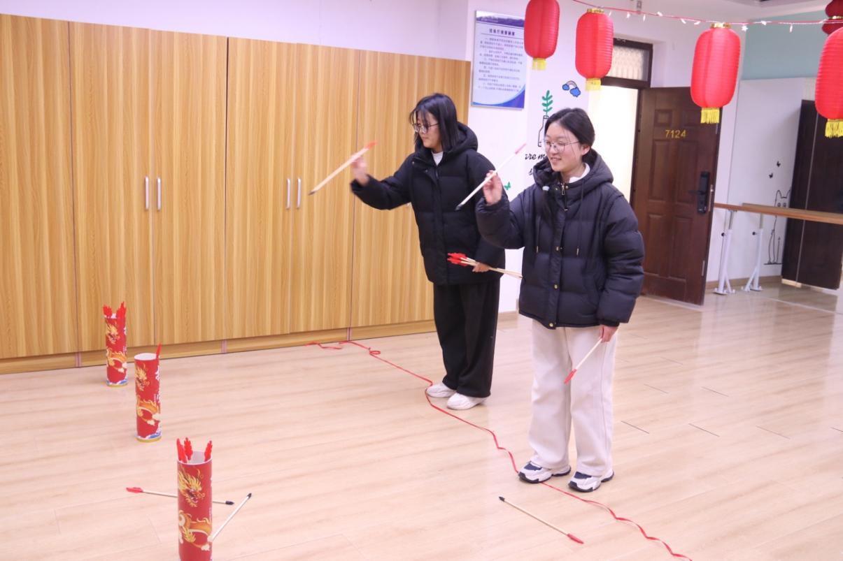排练厅内,投壶游戏引得阵阵喝彩。这项古代雅趣游戏吸引了不少同学排队挑战。手持箭矢、瞄准壶口,一次次尝试投掷,现场不时传来投中后的欢呼喝彩。大家在游戏中感受传统礼仪的魅力,同时祈愿新学年如骏马奔腾、势不可挡。
