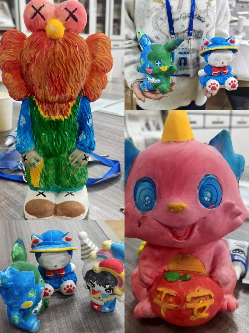 石膏彩绘区则成了脑洞与色彩的乐园:有人精准还原舍长“戴眼镜敲键盘”的经典造型,引得全宿舍笑作一团;有人组队复刻《灌篮高手》天团,将青春记忆涂满娃娃;独自创作的同学则慢调细绘,把石膏娃娃晕染成清新的马卡龙色系,“这个摆件要放在我的书桌最显眼处!”