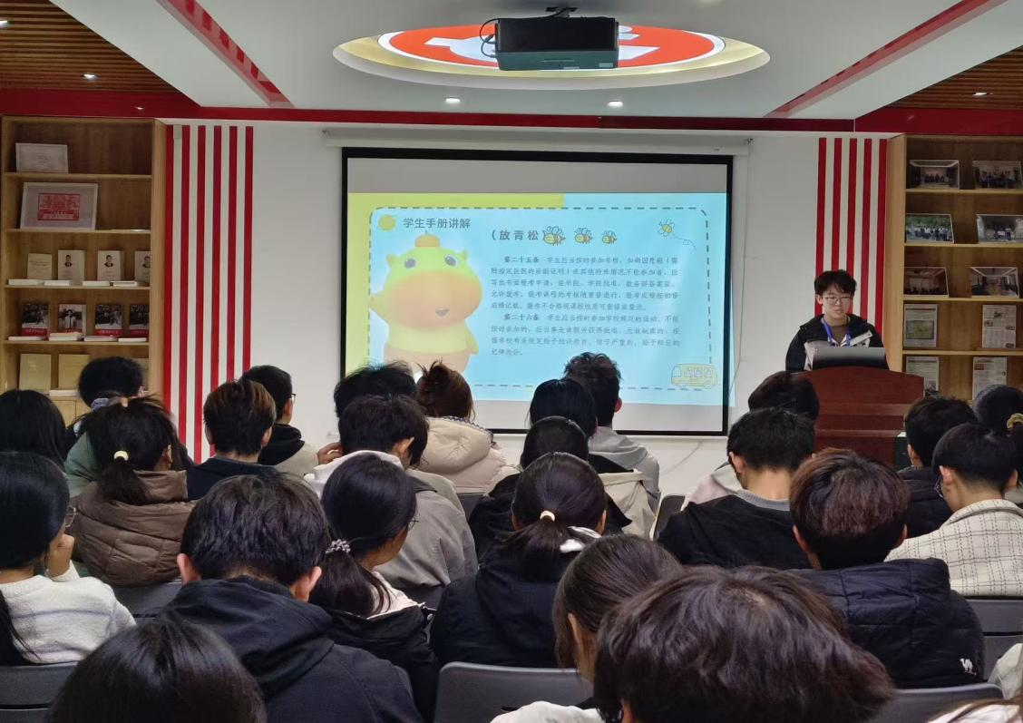 为帮助2025 级新生快速掌握校园管理规范,筑牢大学生活 “规则基石”,11 月 22 日至 12 月 3 日期间,我院朋辈导师团队于思政影厅累计开展8场《学生管理手册》专题讲解活动,本次活动覆盖书院全体2025级学生。