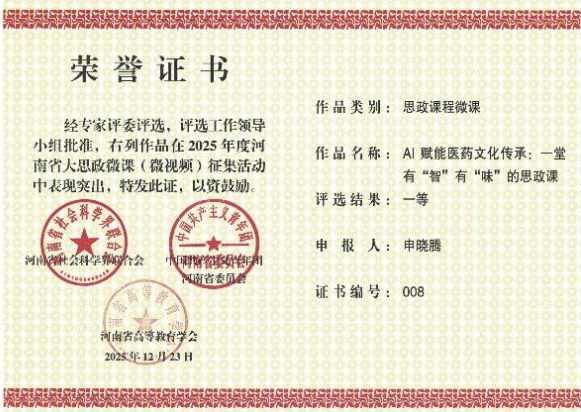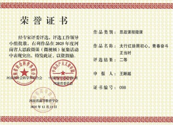 近日,由河南省社科联、共青团河南省委、河南省高等教育学会联合主办的2025年度河南省大思政微课(微视频)征集活动评选结果揭晓,我院教师荣获“思政课程微课”一等奖1项、二等奖2项,指导学生荣获“大学生主题微视频”一等奖1项,充分展现了扎实功底与创新活力。