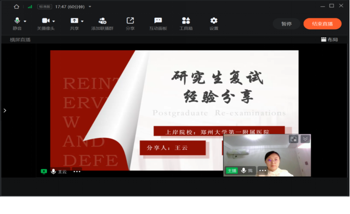 为助力学子明晰考研复试备考方向,掌握面试核心技巧,缓解复试备考焦虑,近日,河南医药大学麻醉学院考研面试经验分享大会以钉钉线上会议形式顺利举办。本次会议由21级辅导员刘慧仿主持,学院特邀2020级成功上岸的四位优秀学生代表郭珂莹、李亚婷、王蒙雨、王云,为全院考研学子倾囊相授复试实战经验、备考策略与临场心得,众多学子线上参会学习,现场交流氛围热烈。