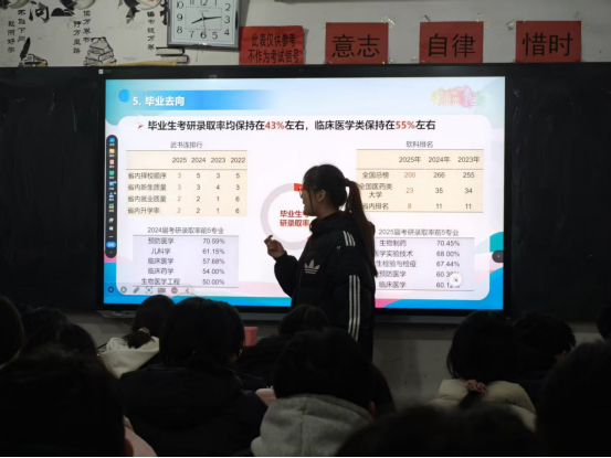 活动中,宣传团通过PPT和校园宣传视频,生动展示了河南医药大学的校园环境、特色专业与医药文化魅力。成员们结合自身经历,分享高考备考经验与大学生活感悟,激发了同学们对医药高等学府的向往。随后,团队针对寒假交通出行、网络诈骗、居家消防及冬季传染病预防等安全问题,结合真实案例进行讲解,提醒同学们绷紧安全之弦,平安度过假期。现场互动热烈,同学们踊跃提问,团队成员耐心解答,气氛活跃。