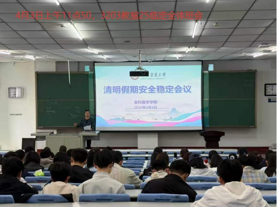 本网讯(付佳博/文 石沛鑫/图)为切实保障全体学生度过一个安全、文明、健康的清明节假期,4月2日至3日,我院分批召开清明节假期主题班会,班会由我院学生辅导员包巍、袁永庆主持,全体学生参会。会议围绕假期安全、校园消防、健康防护等关键事项开展全面安全教育,切实筑牢学生假期安全防线。