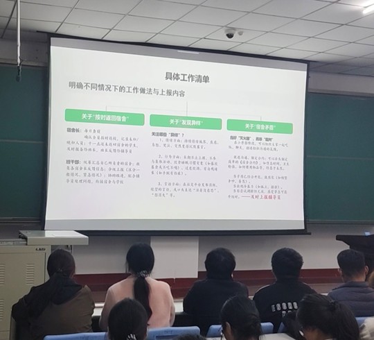 本次培训清晰界定了四级网格化管理的核心逻辑:以宿舍为最小网格单元,由宿舍长担任网格负责人,班干部统筹协调,再通过 “宿舍长→班干部→班主任→辅导员→学生工作负责人” 的层层衔接体系,实现 “分片包干、责任到人” 的精细化管理。培训现场让参会骨干直观了解网格架构与分工模式,确保每一位学生、每一个细节都有人盯、有人管、有人反馈。