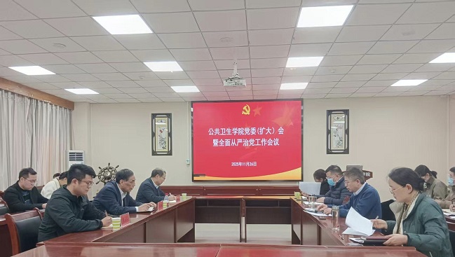 11 月 26 日下午,公共卫生学院党委(扩大)会议暨全面从严治党工作会议在学院报告厅举行。校党委第二巡察组组长李在科、副组长柴汝闯及巡察组成员董玉印到会指导,学院领导班子、党委委员、科室负责人和各支部书记参加会议,会议由学院党委负责人主持。
