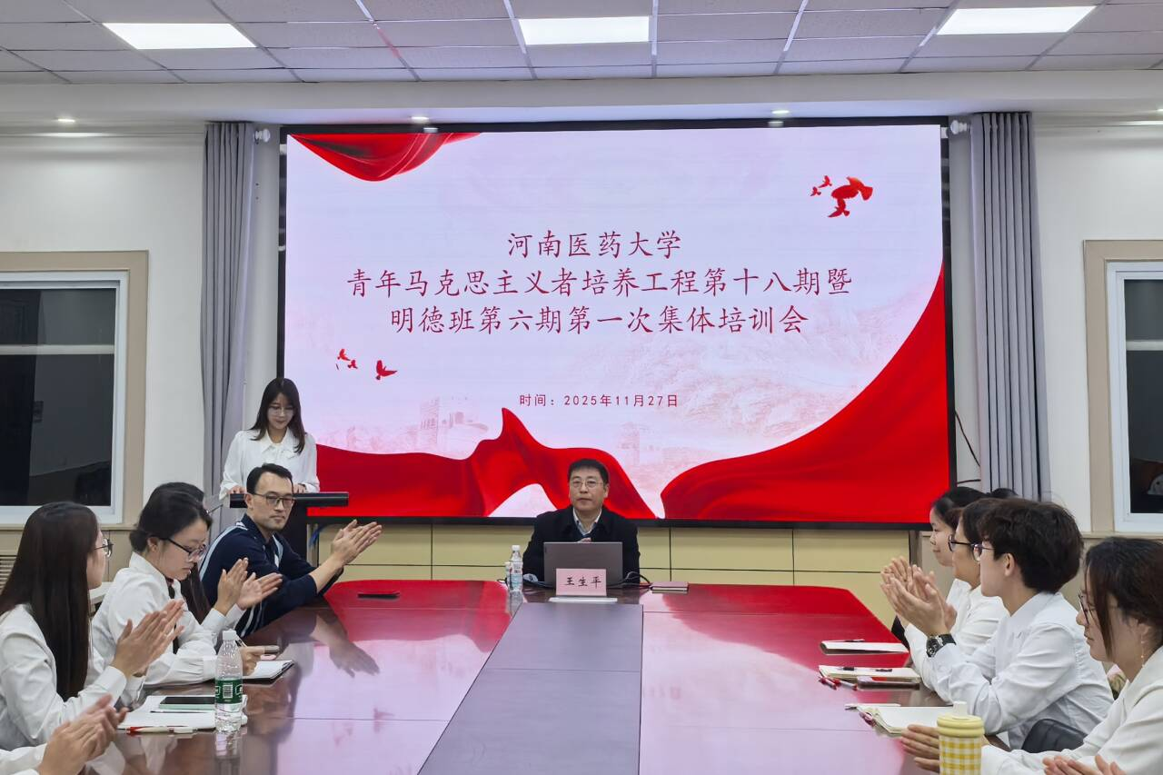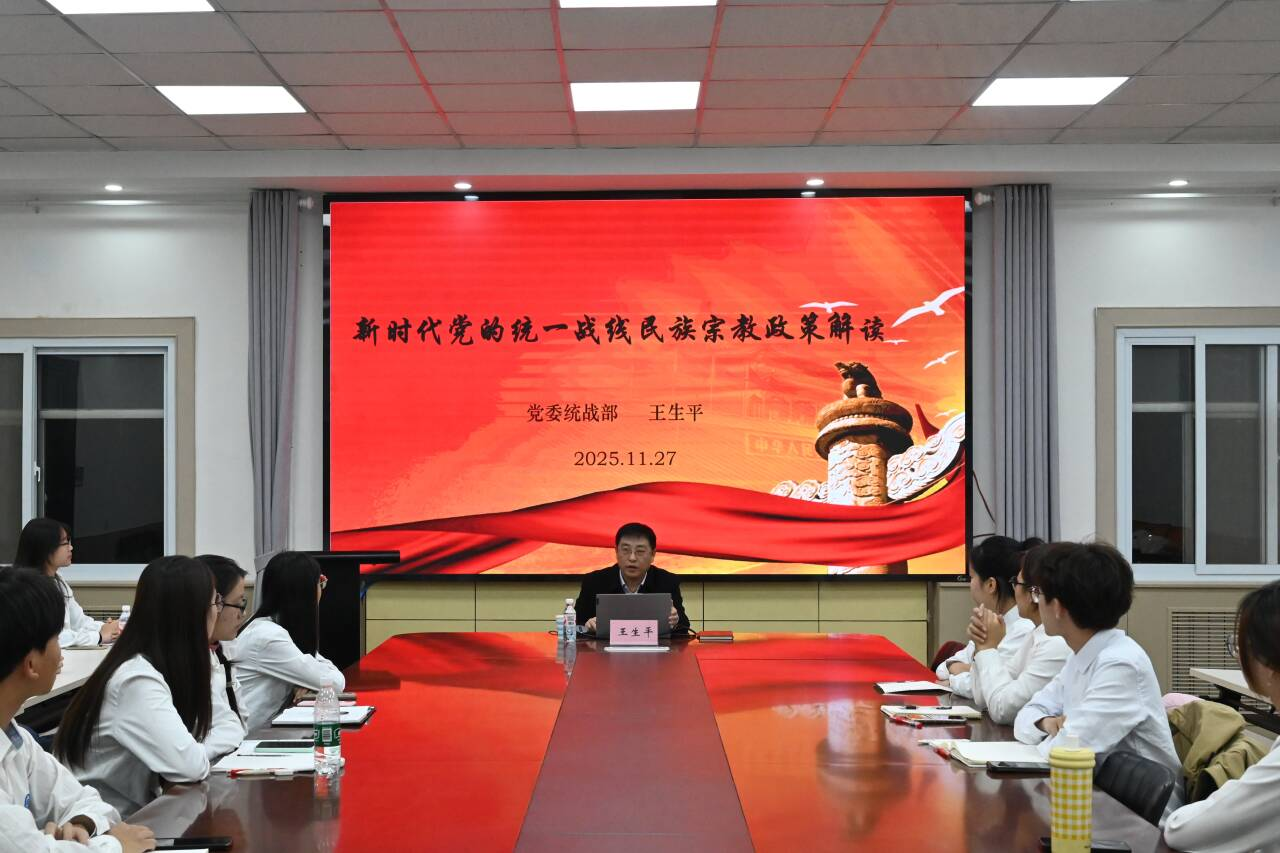 为深入学习贯彻习近平新时代中国特色社会主义思想,全面贯彻党的二十大精神,引导广大团员青年准确把握新时代党的民族宗教工作方针政策,进一步铸牢中华民族共同体意识。河南医药大学“青年马克思主义者培养工程”明德班于2025年11月27日举办专题理论学习会。学习会聚焦新时代党的统一战线与民族宗教工作的核心要义,坚持理论高度与实践深度相结合,取得了扎实成效。学校党委统战部部长王生平应邀作专题辅导报告,明德班全体学员参加学习,班长李鑫主持会议。