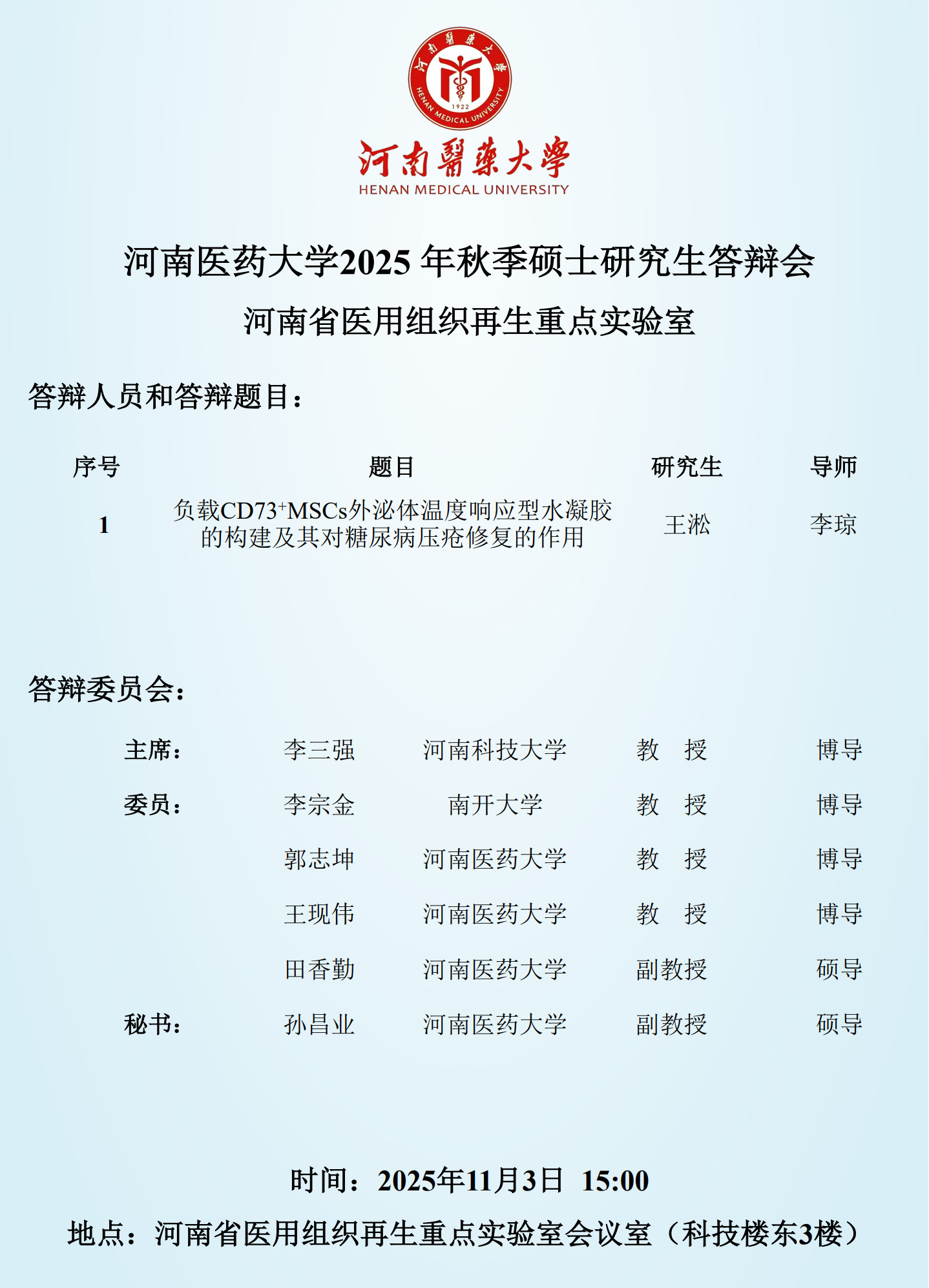2025下半年河南医药大学河南省医用组织再生重点实验室硕士学位论文答辩会