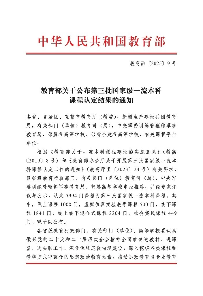 近日,教育部公布了第三批国家级一流本科课程认定结果,我院由秦鑫教授课程团队负责的《医学仪器原理》课程成功入选。