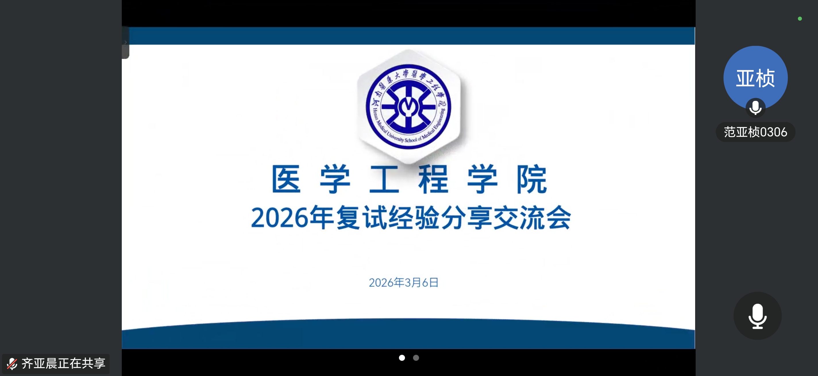 为切实做好考研学生服务保障工作,助力同学们精准把握复试要点、提升应试能力、增强备考信心,3月6日19:00,医学工程学院举办线上2026年考研复试经验分享交流会。活动特邀多位成功上岸的优秀学长学姐担任分享嘉宾,学院辅导员范亚桢及全体备考学生共同参与本次交流会。