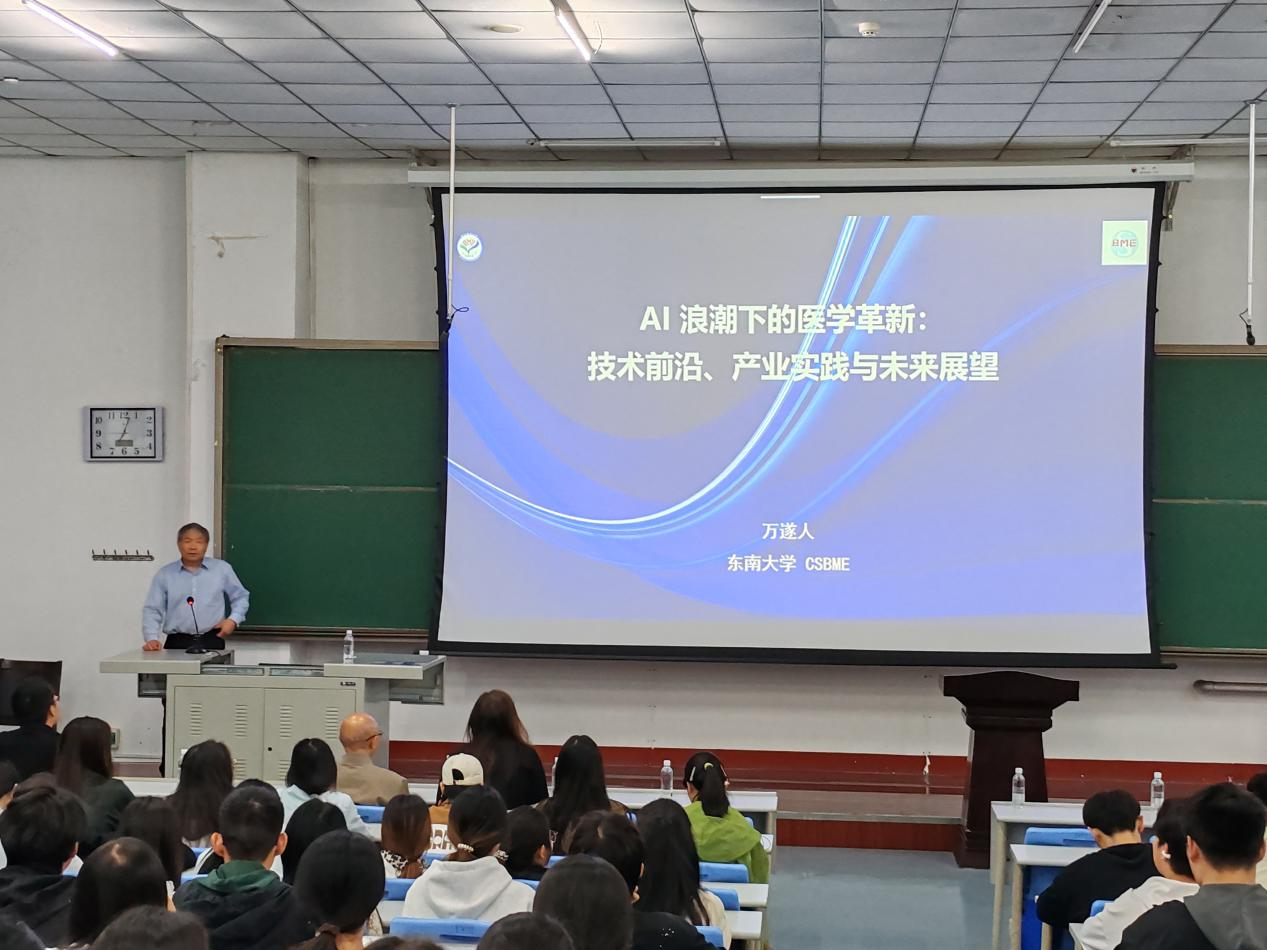 首先,万遂人教授以“AI浪潮下的医学革新:技术前沿、产业实践与未来展望”为题,开启了精彩分享。他结合自身在美国麻省理工学院(MIT)的访问科学家经历与长期研究,深入剖析了人工智能技术如何驱动医学诊断、治疗与健康管理的深刻变革,并对未来医工融合的创新生态与发展趋势进行了前瞻性展望,激发了同学们的浓厚兴趣。