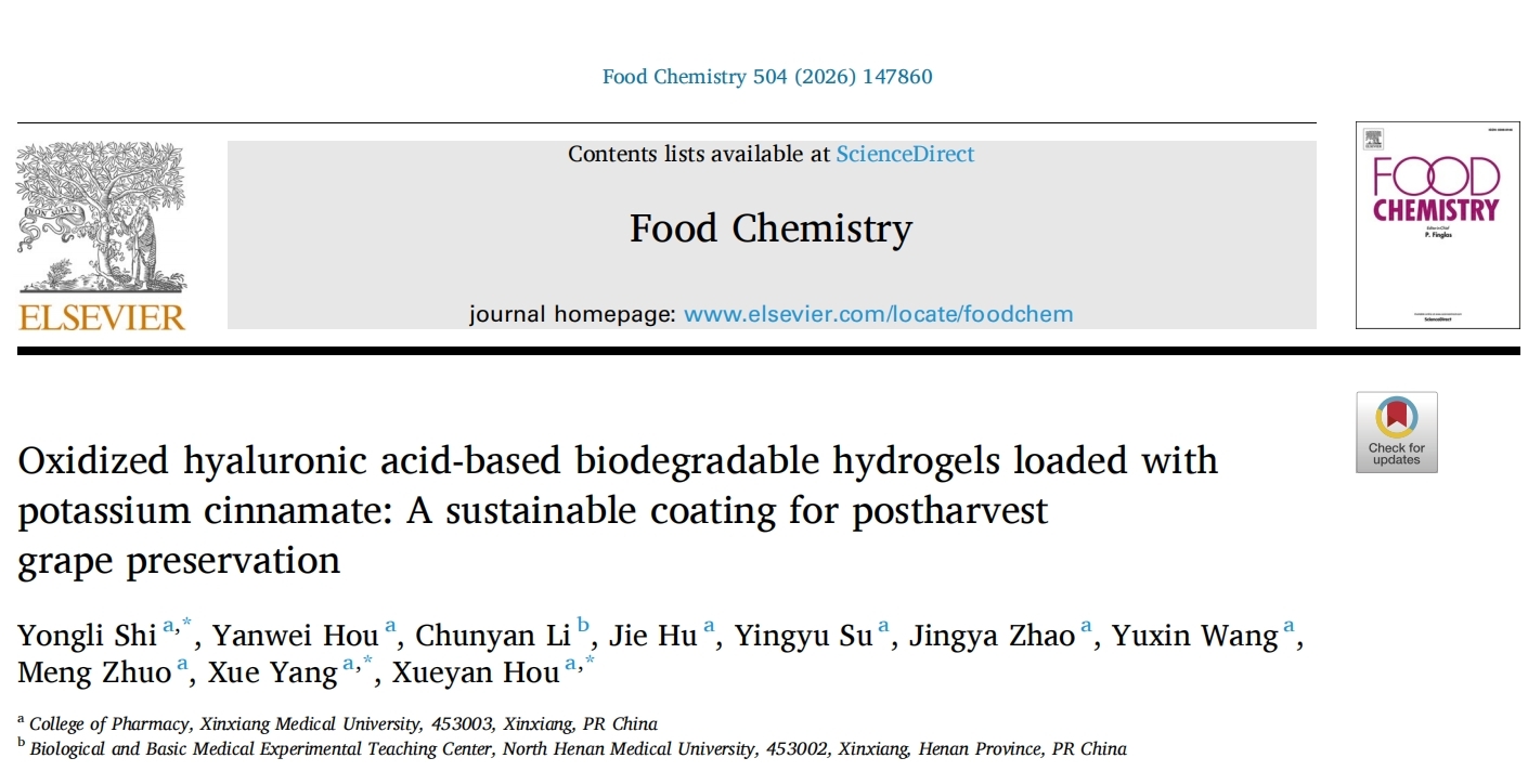 近日,我院药剂学团队在国际权威期刊《Food Chemistry》上发表题为 “Oxidized hyaluronic acid-based biodegradable hydrogels loaded with potassium cinnamate: A sustainable coating for postharvest grape preservation” 的研究论文,药学院为本研究第一通讯单位,药剂学教研室史永利老师为第一作者,药剂学教研室杨雪,侯雪艳及史永利老师为共同通讯作者。