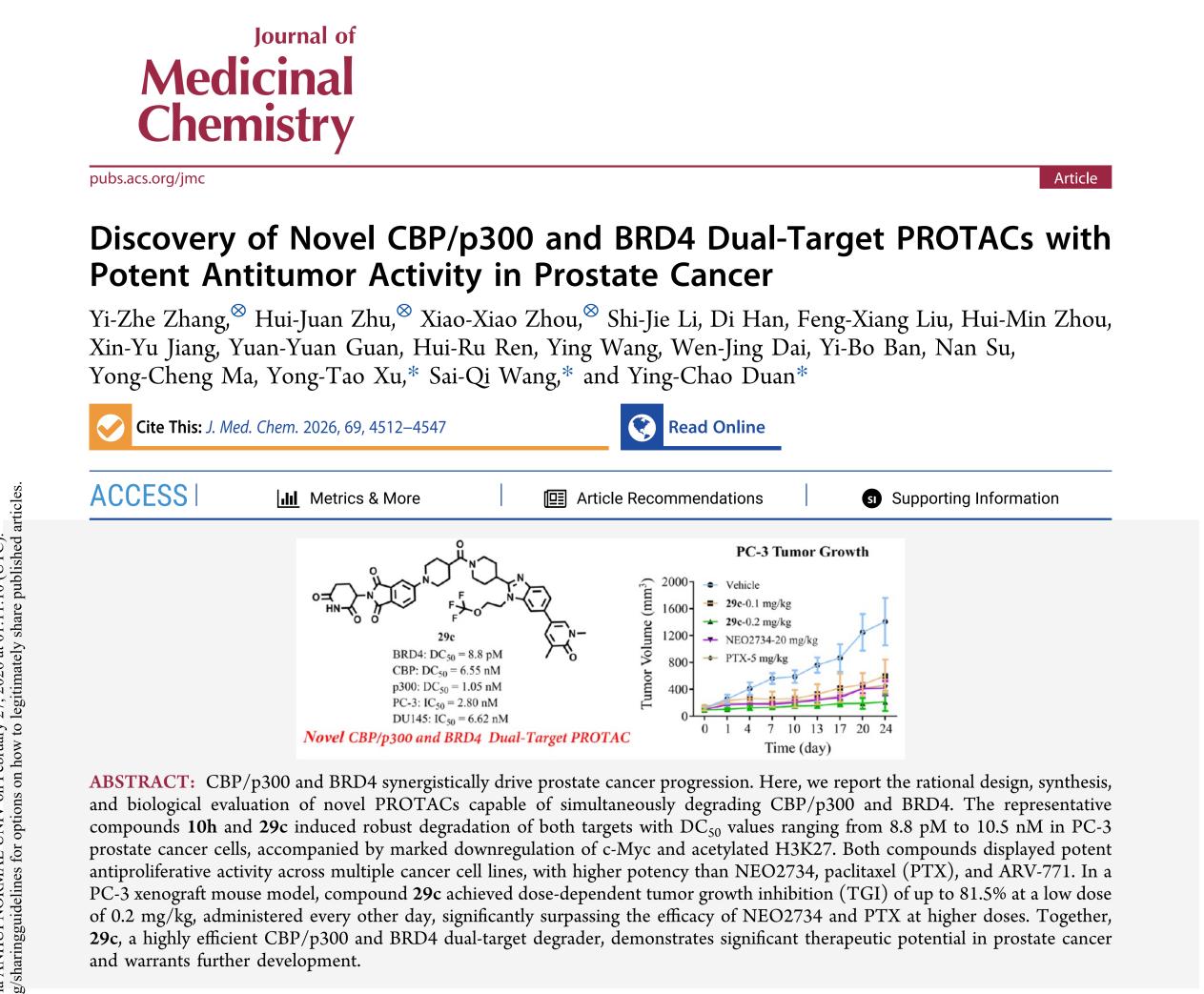 近日,我院段迎超教授在药物化学领域顶级期刊《Journal of Medicinal Chemistry》在线发表了题为“Discovery of Novel CBP/p300 and BRD4 Dual-target PROTACs with Potent Antitumor Activity in Prostate Cancer”的研究成果。药学院研究生张宜锗、朱慧娟、周笑笑为共同第一作者,我校段迎超教授、徐永涛教授和河南省肿瘤医院王赛琪博士为共同通讯作者,我校为该论文第一完成单位。郑州大学实验动物中心石晓静博士对该研究提供了帮助。