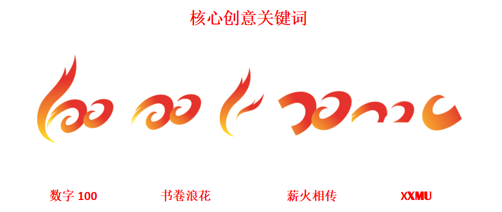 整体标志设计将字母形式抽象变化概念呈现为薪火相传形态,体现百年新医服务医学教育发展属性、服务学生、以人为本,百年传统传承优秀品质,服务地方医学发展,结合书卷形态,进一步体现教育属性。整体新医百年校庆标志采用传统的中国红体现,推广应用时可将数字“100”采用金色概念化变化,体现新医百年历史、百年奋斗、百年收获。
