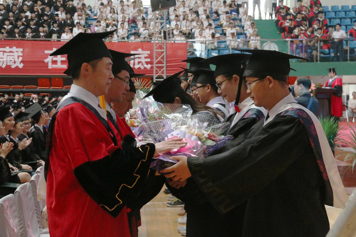 在悠扬的乐曲中,校领导与2015届毕业生一一握手并拨正流苏,为其颁发学位证书,相机定格了这次毕业生生命中珍贵的时刻。