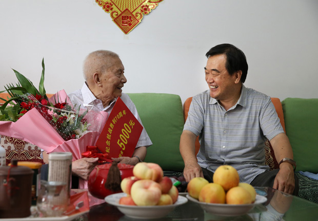 在我校抗战时期及以前参加革命工作离休干部张银堂、丁树礼、任俊卿、陈寿彰、郭希水、武林、石建国、崔玉振家中,慰问人员与老干部们促膝交谈,回忆革命战争时期的峥嵘岁月和中国共产党走过的光辉历程,并送上亲切的问候和慰问金5000元。郑怀庆叮嘱随行的相关部门负责同志,要切实关注老干部们的晚年生活,经常了解他们的生活状况,用实际行动帮助他们解决生活中的实际问题。