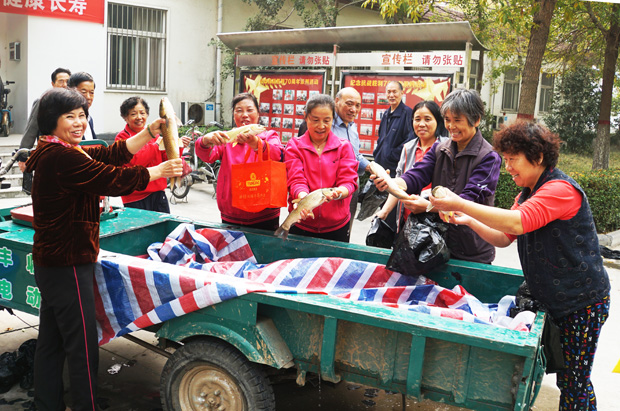 10月21日重阳节当天上午,离退休职工工作处配合后勤管理处,将在学校人工湖饲养的千余斤新鲜活鱼作为节日礼物送给离退休职工。老同志手捧着鱼,脸上露出了幸福的笑容,他们纷纷表达感谢,一条鱼事儿小,却体现了学校对老同志的深情关爱。