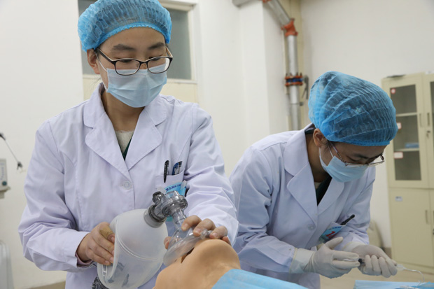 本网讯(文/南晶敏捷 王乾坤 图/丁毅民)“您醒醒!能听到我说话吗?”在实习生临床基本技能竞赛第2考站内,正在进行心肺复苏操作的选手伏在医用模拟人身边大声呼唤,双手相叠用力按压“病人”胸部,同时口中简洁有力地喊着数字。面对突然心脏骤停的情况,3名选手动作有条不紊,相互配合,还不忘密切注视“病人”的意识变化。
