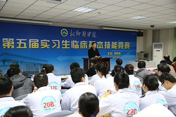 1月31日上午8时,在院系楼七楼临床技能培训中心,第五届实习生临床基本技能竞赛如期举行。来自第一附属医院、河南省人民医院、中国人民解放军第150中心医院等21所实习教学医院的88名临床医学专业实习生在此展开激烈角逐。副校长、第五届实习生临床基本技能竞赛领导小组组长郭志坤出席竞赛开幕式并讲话。