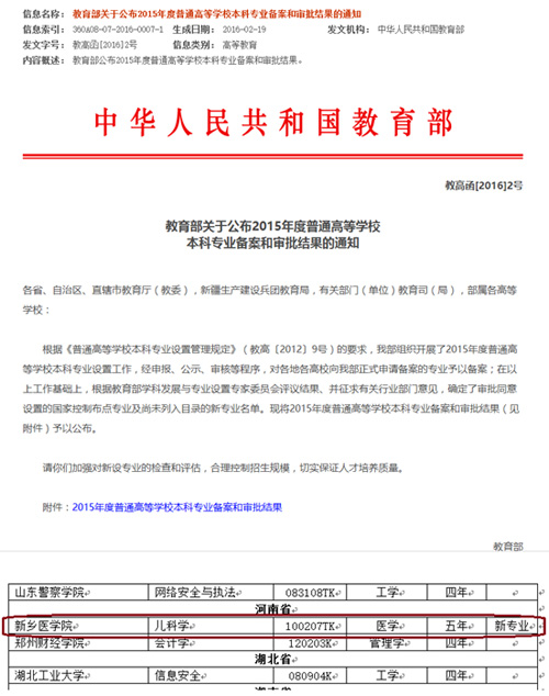 本网讯(图·文/王克杰)近日,教育部印发了《教育部关于公布2015年度普通高等学校本科专业备案和审批结果的通知》【教高函[2016]2号】,我校申报的儿科学(100207TK)五年制本科专业经教育部专家审核评议、社会公示,已获批设立,我校成为全国首批恢复举办儿科学本科专业的八所院校之一,该专业将于2016年正式招生。