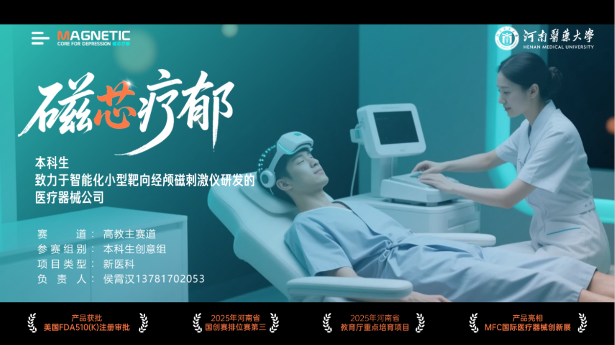 获银奖项目“磁芯疗郁——本科生致力于智能化小型靶向经颅磁刺激仪研发的医疗器械公司”是由第二临床学院李文强教授团队指导,基础医学院学生侯霄汉负责。该项目聚焦神经调控领域关键技术,成功研发出国产首款小型精准靶向经颅磁刺激Magticore,突破了“小型化-精定位-智能化”的技术壁垒,开辟了家庭颅磁治疗新场景,为抑郁症患者提供便携有效的家庭治疗新方案。