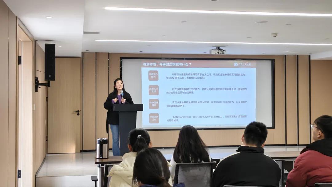 在政治专题讲座中,王瑶老师以“看清本质、高效突击、把握关键、解读时政、长远规划、冲刺备考”为主线展开讲解。首先从考研政治的内在逻辑与学习要领入手,系统梳理政治科目五门课程的核心要点,提供针对性的复习路径与答题方法,并运用矛盾分析法,阐释“抓住不变核心,应对形式变化”的备考策略。其次在复习规划方面,提出“三轮冲刺计划”,答题策略上,她推荐“原理—阐释—结合—升华”四步作答法,强调卷面整洁、分点陈述与答案完整度等实战技巧。