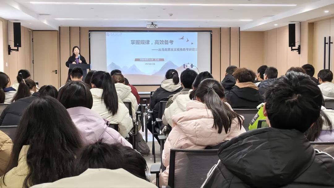 此次特邀河南师范大学外语学院陈晨老师主讲考研英语专题《考研英语核心考点与解题思路》。河南师范大学马克思主义学院王瑶老师主讲政治专题《掌握规律、高效备考——从马克思主义视角看考研政治》,现场座无虚席,百余名见实习学子线上参会。两场讲座分别围绕考研英语与考研政治的高效备考策略展开,既为备战考研的同学指明方向,也为低年级学生提供了长远的学习规划参考。