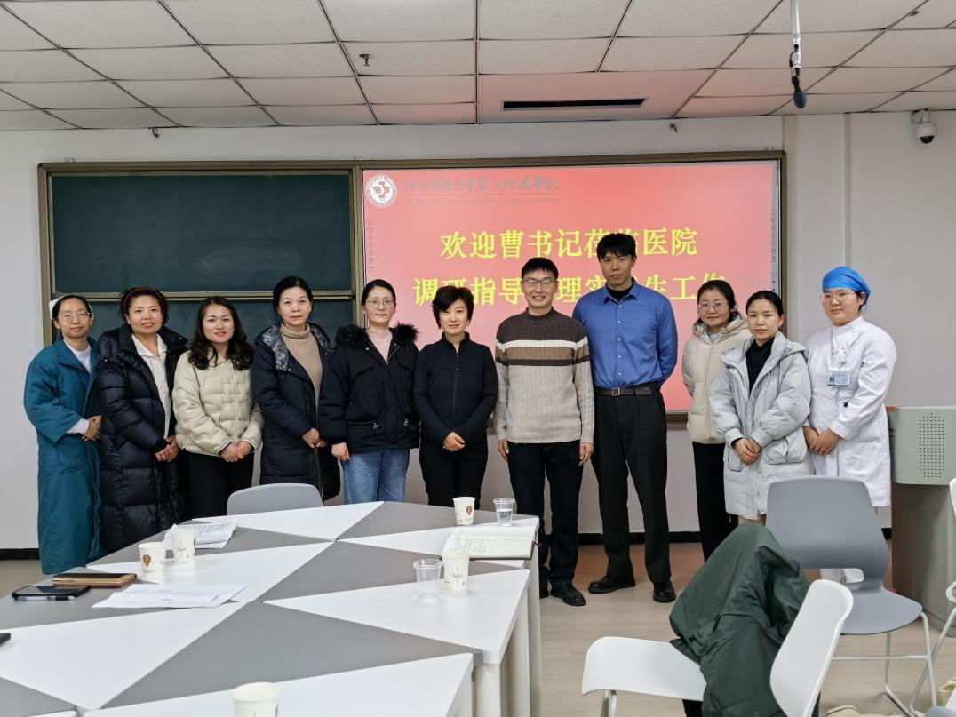 为切实掌握2026届护理专业实习生的实习动态,强化实习过程管理,保障实习安全与质量,1月5日,河南医药大学护理学院副书记曹坤明、学生工作办公室本科生辅导员王沛,先后赴河南医药大学第一附属医院、第三附属医院和附属人民医院三所实习基地,开展座谈交流与安全教育工作。