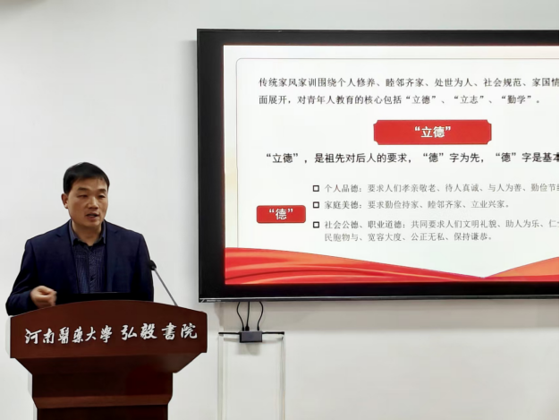 课堂上,他从传统家风家训的核心价值出发,阐述了家风家训是家庭世代传承的价值观念与行为准则的集合,既承载着孝亲睦邻、勤俭守正的个人品德修养,蕴含着睦邻齐家、立业兴家的家庭美德追求,更沉淀着文明礼敬、仁厚奉公的社会公德底色。而 “立德、立志、勤学” 的精神内核,正是家风家训滋养青年成长的关键所在,以 “德” 为基方能筑牢品格之魂,以 “志” 为向方能明晰初心之路,以 “勤学” 为径方能增长干事之能,这份历经岁月沉淀的思想富矿,终将成为青年砥砺前行的精神滋养。