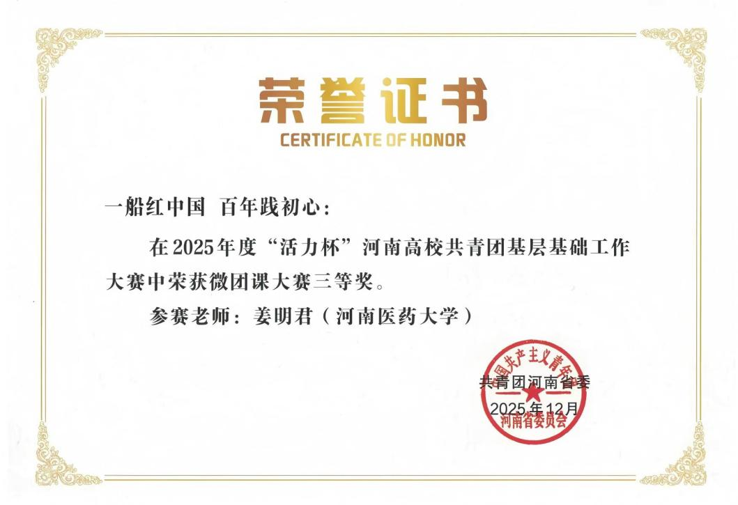 本次大赛由共青团河南省委主办,聚焦高校共青团基层基础工作提质增效,吸引了全省各高校优秀团干同台竞技。大赛历经层层筛选,姜明君老师以 “一船红中国 百年践初心” 为主题紧扣医药类高校育人特色与书院育人理念,将红色精神传承与青年成长发展深度融合,打造出兼具思想性、趣味性与感染力的微团课,赢得评委与主办方的高度认可。