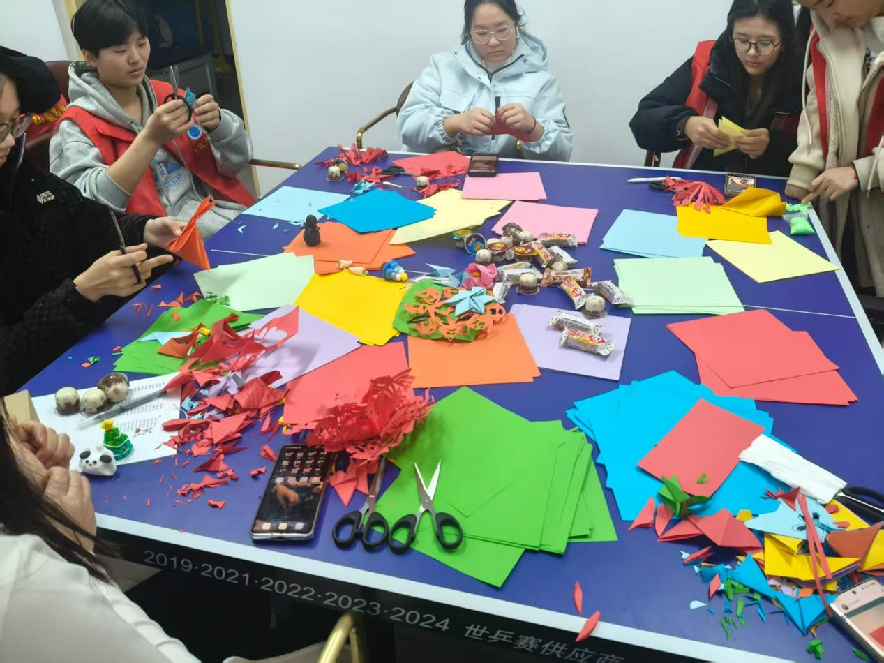 “指尖生花·剪暖冬”剪纸体验区,工作人员提前准备好彩纸和剪刀,同学们围坐在一起一步步操作。从折叠红纸到勾勒线条,再到裁剪成型,大家都做得十分认真。不一会儿,一个个剪纸作品就完成了,同学们拿着自己的作品,脸上满是成就感。
