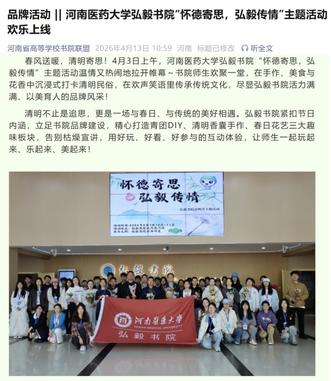 为深切缅怀革命先烈、传承中华优秀传统文化,同时落实书院美育育人理念,搭建师生互动交流平台,2026年4月3日上午,河南医药大学弘毅书院精心打造的“怀德寄思,弘毅传情”主题活动温情上线,尽显书院活力满满的育人风采。该活动被河南省高等学校书院联盟公众号报道。https://mp.weixin.qq.com/s/mfQlev8Btw8fIegt54r8_A?scene=1&click_id=1