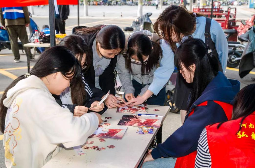 清明寄思·薪火拼图竞速环节将红色历史知识与趣味竞赛相结合,拼图图案涵盖革命历史场景、红色地标、先烈事迹等内容,同学们全神贯注、默契配合,在快速拼接的过程中,重温革命岁月的峥嵘历程,加深对红色历史的认知与理解,在竞速比拼中感受红色文化的魅力,现场加油声、欢笑声此起彼伏,热闹非凡。