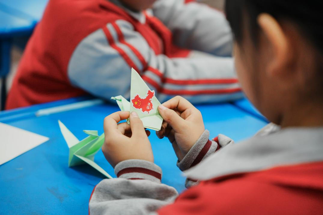 在“红色情景手工坊”核心,大学生志愿者手把手教小学生折纸和平鸽,从折叠翅膀到粘贴“中国地图贴纸”,每一步都融入思政意涵:“折紧翅膀,就像我们守护家园;贴上地图,要记得我们的根在哪里。”这一刻,折纸不再是简单手工,而是大中小学共同践行“爱国行动”的生动实践,实现思政教育“知”与“行”的统一。