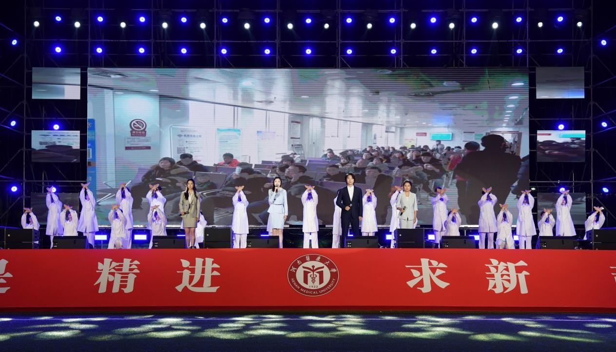 第一篇章为“志存高远·起航”。大学生合唱团演唱的《初心与恒心》传递出青年一代对理想坚定不移的追求;大学生艺术团的舞蹈《一条大河》以磅礴气势展现锚定目标、勇毅前行的决心;朗诵节目《医路同行,药启新程》聚焦医学生的志向担当,勾勒出青年学子奋发有为的志向底色。