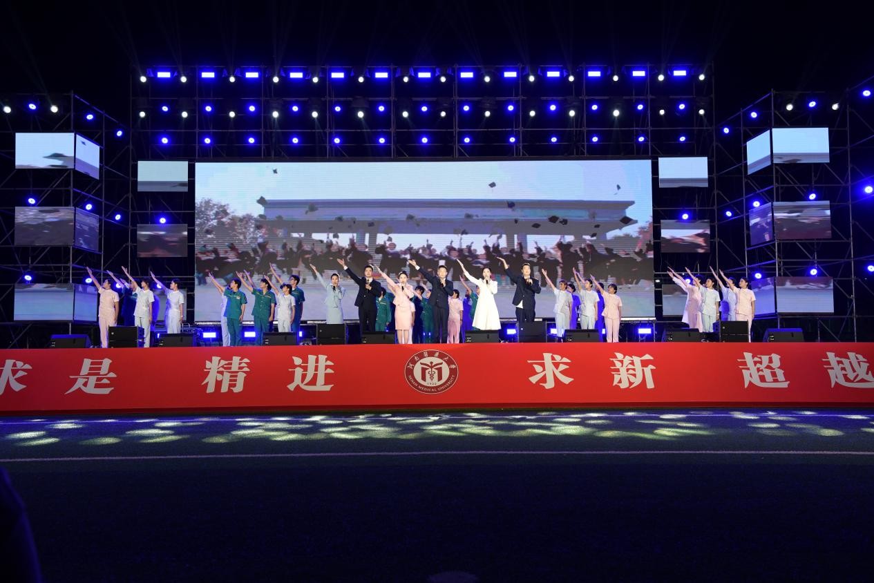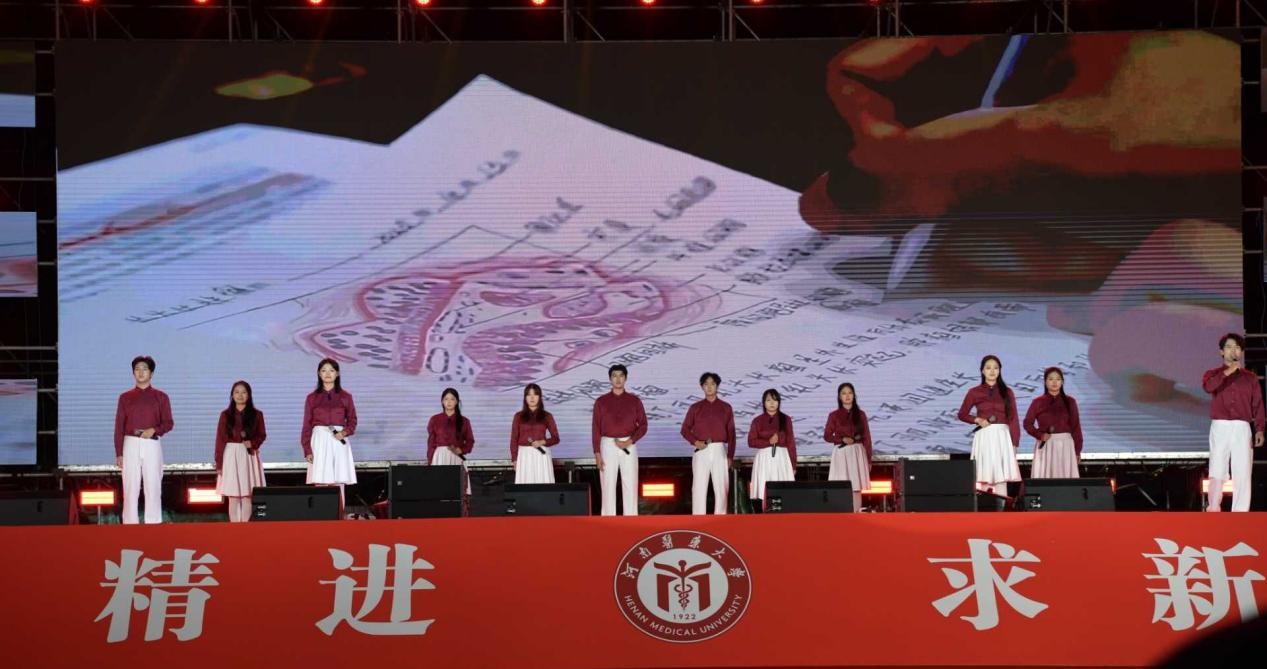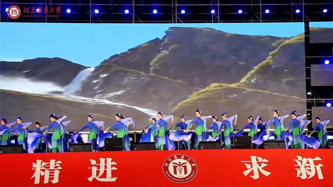 第三篇章为“梦想远征·绽放”。校大学生艺术团的歌曲《梦想成真》以动人旋律承载学子们对未来的美好向往;附属人民医院的诗伴舞《白衣映山河》呈现青春绽放的动人姿态;第三附属医院带来的戏曲《话梨园》引领师生共赴一场千年文化之约;第二附属医院的歌伴舞《再一次出发》以激昂歌声和有力舞姿,传递出“与时代同频、向梦想奋进”的坚定决心。